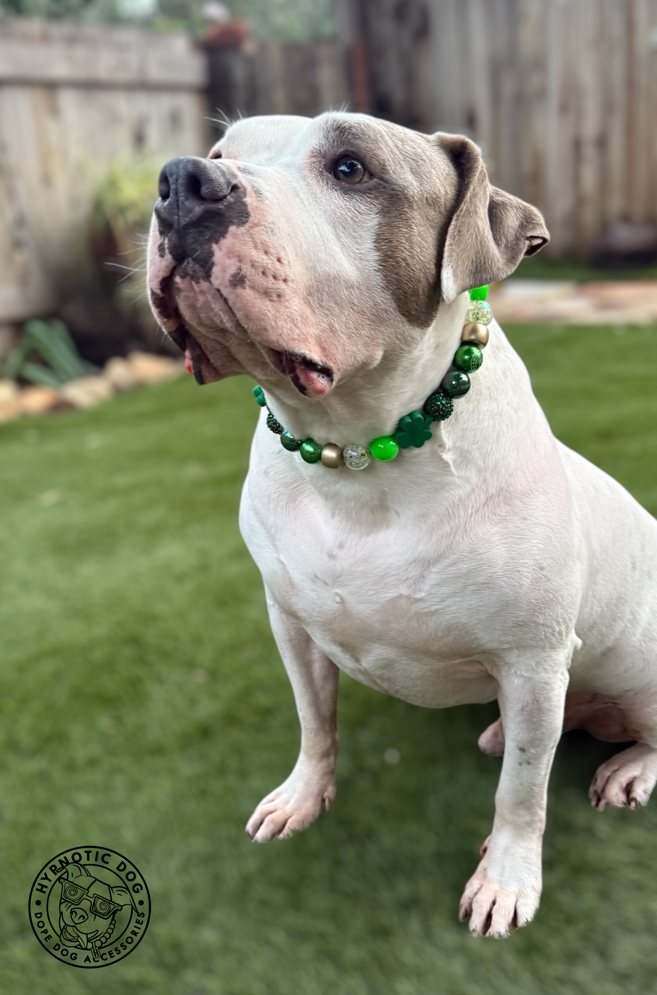 ↠ Pot of Gold Acrylic Bead CollarĀ ā†ž New St. Patrick's Day collar! šŸ€ Green pearl acrylic beads, green resin rhinestone sparkle beads, neon kelly green, lime green crackle beads, antique gold chunky divider beads, and XL-sized clover silicone beads.Ā