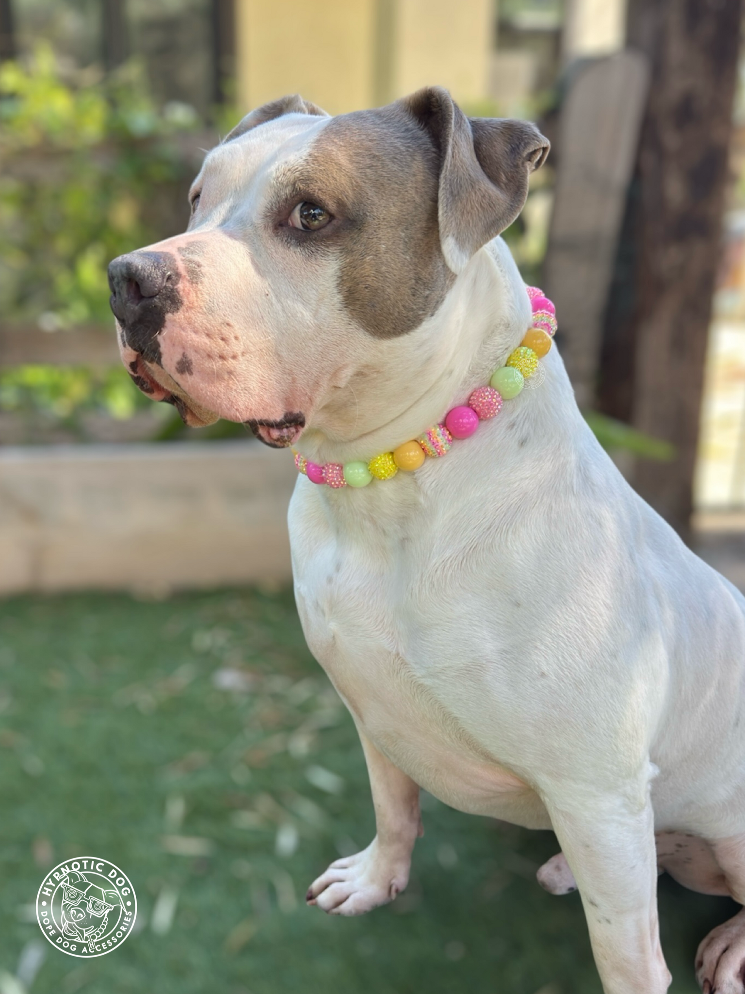 Citrus Sunrise Bead Colla↞ This extra bright Spring mix has smooth, lightweight acrylic yellow, and pink beads paired matte melon green beads, and matching resin rhinestone beads!