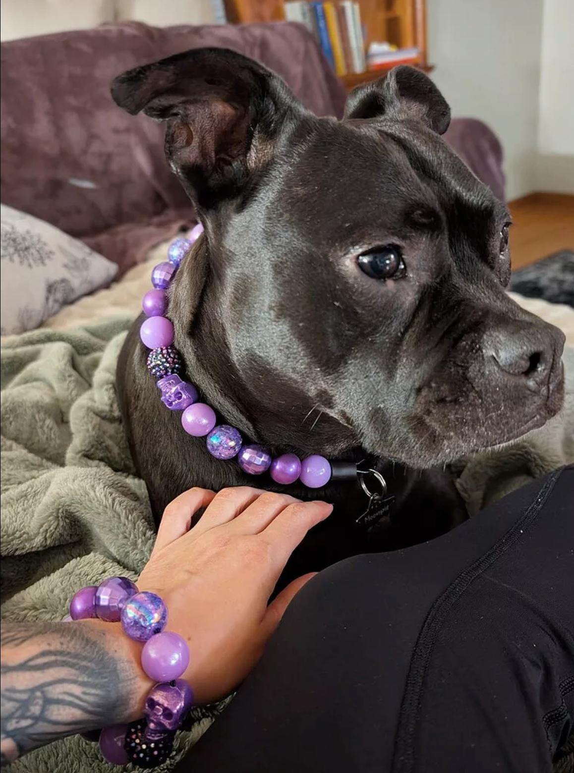 ā Purple Glitter SkullĀ CollarĀ ā Smooth, lightweight mix of purple crackle acrylic beads, metallic glitter silicone beads, purple faceted pearl beads, dark purple resin rhinestone sparkle beads, paired with *new* glitter silicone skull beads make up this classic purple Halloween collar š!Ā