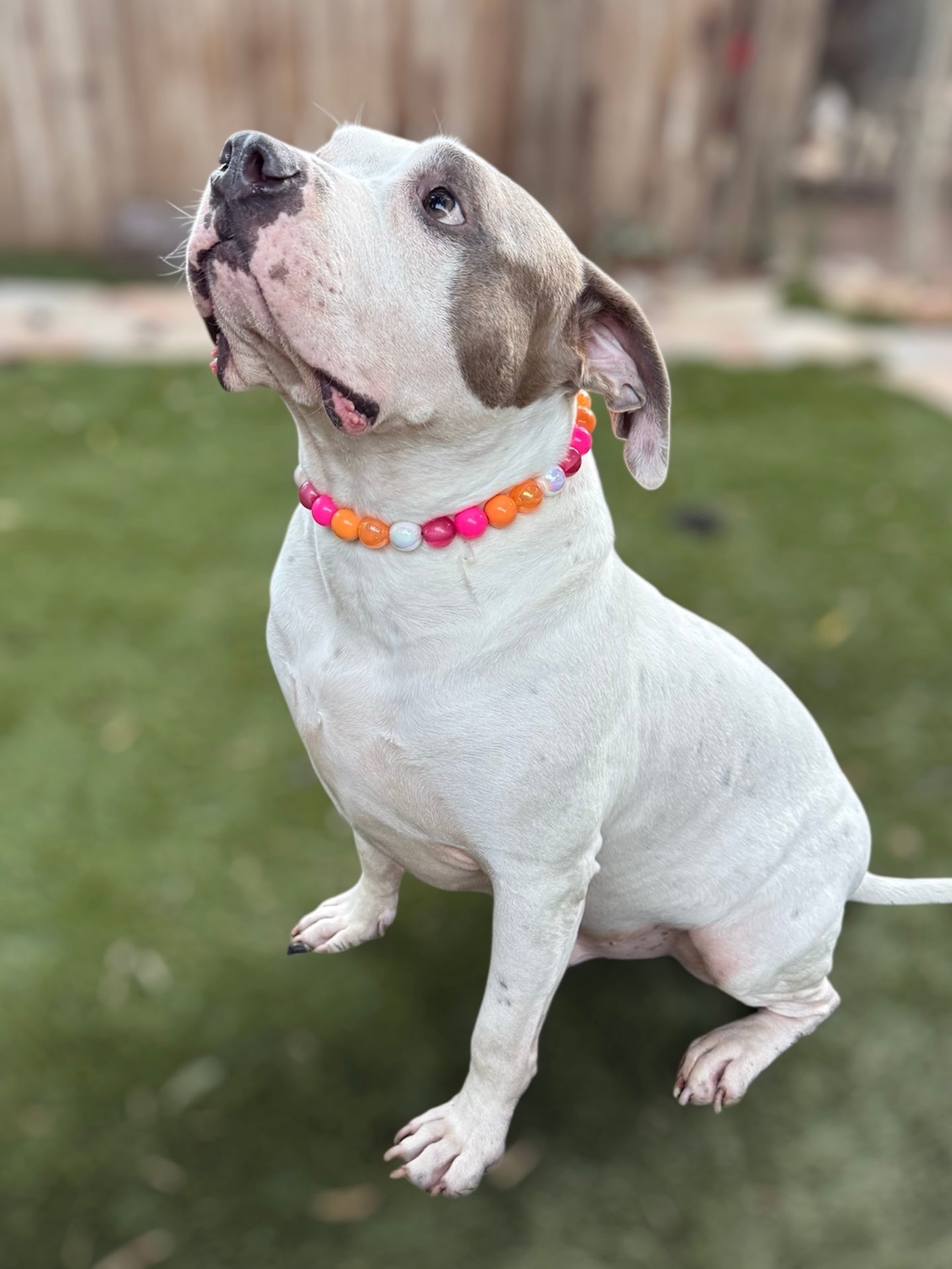 ↠ Coral Reef Acrylic Bead Collar ↞ New! Regular sized shiny white AB plated beads, new raspberry glitter transparent beads paired with bright neon coral pink and tangerine orange acrylic beads.