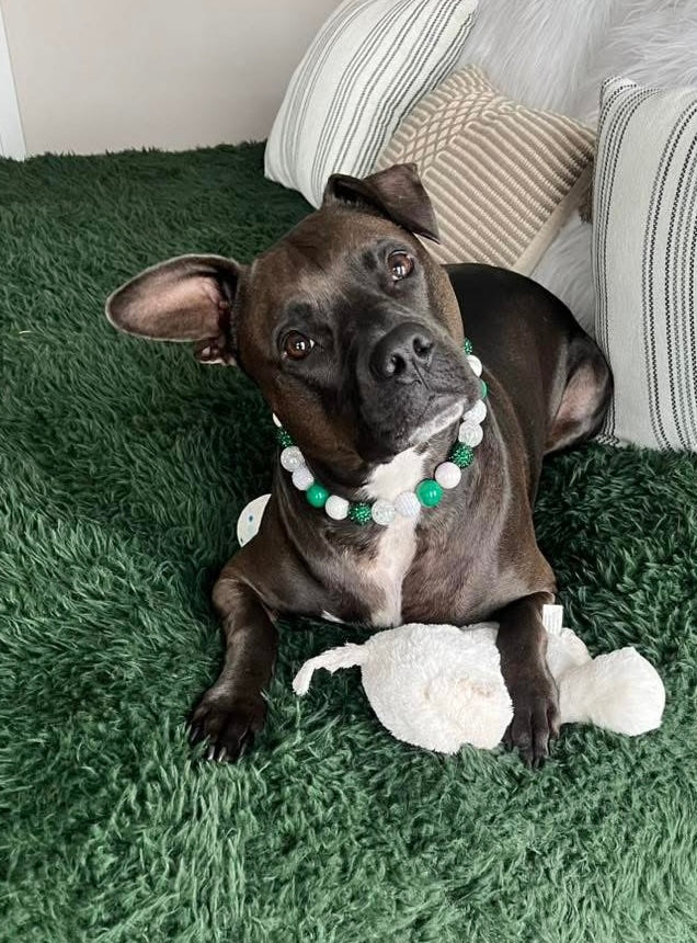↠ Luck of the Irish Bead Collar ↞ Looking for a cute and fun St. Patrick's Day collar? Look no further! Smooth, lightweight, dark green acrylic, white and green resin rhinestone, white crackle, and white plated acrylic beads make up this one! 💚☘️