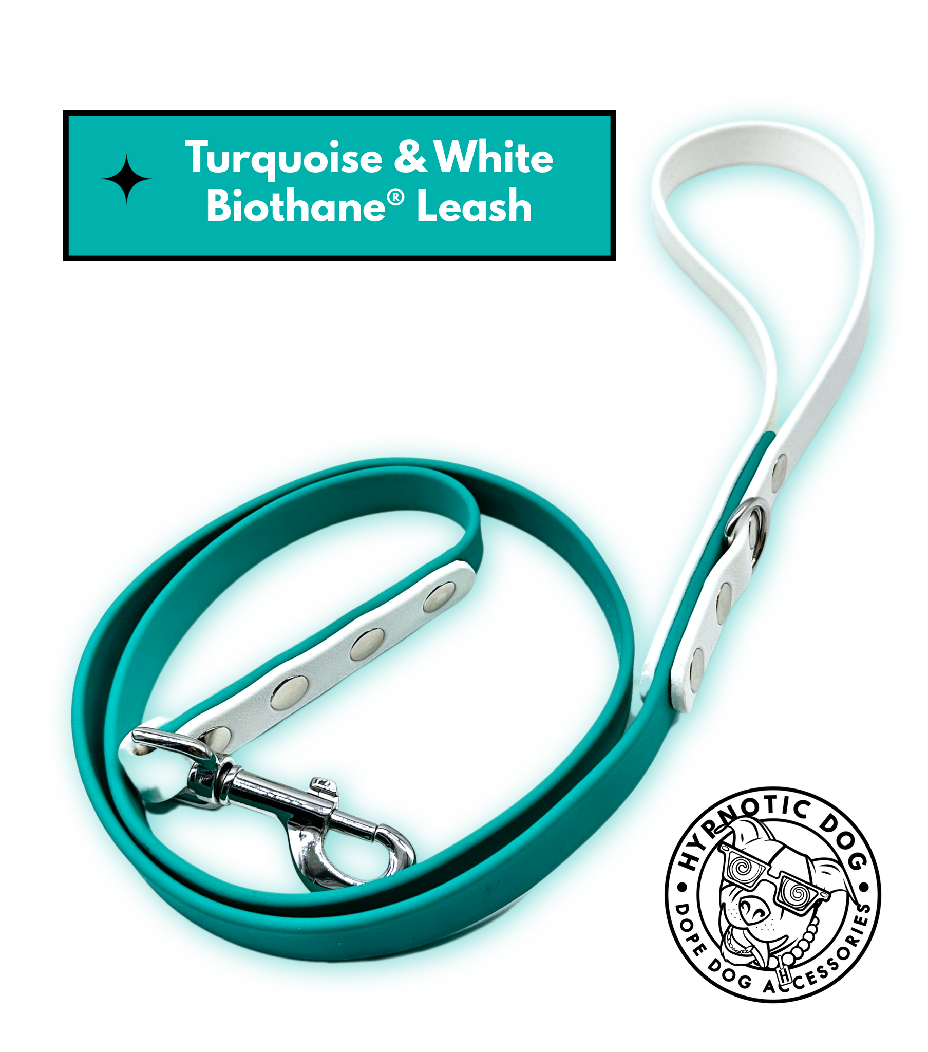 This listing is for a 4 foot or 6 foot Turquoise & White leash made with BioThane® brand, with a sturdy width of 3/4" (strong enough for large dogs!), and one standard loop handle. Both ends of the leash have 4 secure rivets in either plated silver or plated rose gold to match the bolt snap hardware of your choice! Attach poop bag holders or your keys to the fixed D-Ring conveniently attached to your loop handle. Traffic handle upgrade available and is most commonly used in high traffic areas or emergency situations where getting your pup closer to you is needed quickly!